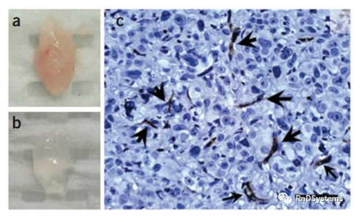 (a,c)用100μL 基質(zhì)膠混合2x105 PC3細(xì)胞,接種到SCID小鼠中9天后血管和腫瘤細(xì)胞的生長情況,(c)箭頭所指為CD31標(biāo)記的表皮細(xì)胞,顯示了腫瘤內(nèi)廣泛的血管形成。(b)為不加PC3細(xì)胞的對照。