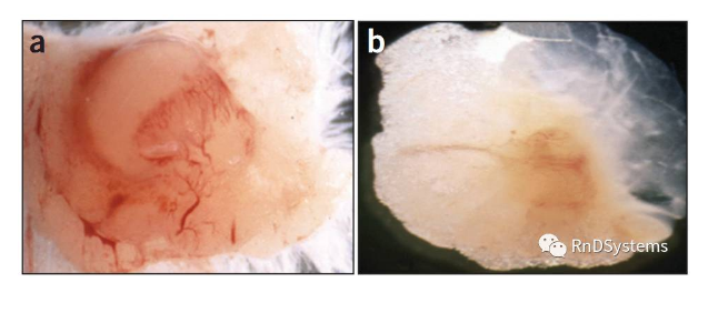 在SCID小鼠乳房內(nèi)脂肪墊中接種106MDA-MB-468后9天的腫瘤生長對比。(a)為混合了低生長因子無酚紅的基質(zhì)膠的實(shí)驗(yàn)組,(b)為不加基質(zhì)膠的對照組?;|(zhì)膠的存在不但加快了腫瘤生長,也促進(jìn)了血管形成。