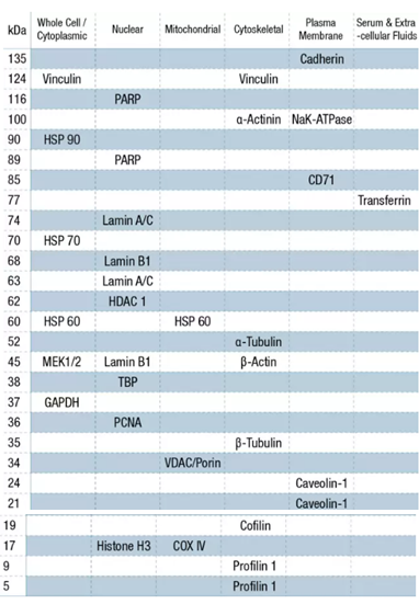 Actin,一種廣泛表達的真核蛋白,是細胞骨架的重要組分。研究證明在原始乳腺癌細胞中Actin是高度磷酸化的(9)。研究也發(fā)現(xiàn)凋亡條件下體外和心臟肌肉以及骨骼肌中都能觀察到Actin的清除(10),因此,不適用于骨骼肌的樣品。Caspase-3對Actin的清除會加速泛素/蛋白酶體依賴的肌肉蛋白酶解(11)。 細胞生長條件的改變以及與胞外基質組分的相互作用都可能會導致Actin蛋白合成的變化 。