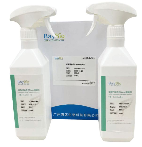 灣區(qū)生物核酸污染及RNase清除劑(貨號(hào):BR-003)分為A液與B液, 液體本身均無(wú)毒,在混合后,會(huì)形成一種有效的、壽命短的混合液,以接觸方式起作用,迅速降解表面上的高水平污染DNA和RNA,以及RNase,可在數(shù)分鐘內(nèi)去除多種表面的污染。
