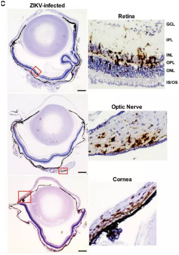 在病毒定位研究中,2015 年巴西寨卡病毒(Zika)爆發(fā)時(shí),華盛頓醫(yī)科大學(xué) Jonathan J. Miner 為首的研究團(tuán)隊(duì)即通過 RNAscope 方法檢測(cè)到寨卡病毒在視網(wǎng)膜,視神經(jīng)和角膜中的分布,直觀給出了該病毒在眼內(nèi)的分布圖(見下圖,病毒陽性信號(hào)為圖中的棕色信號(hào)點(diǎn))[1]