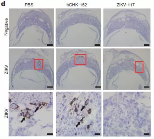 在對(duì)寨卡(Zika)病毒疫苗的研究中,美國 Vanderbilt University 的 Gopal 研究團(tuán)隊(duì)發(fā)現(xiàn)人的單克隆抗體 ZIKV-117 可以有效減低小鼠感染 Zika 后組織的病理特點(diǎn),并通過 RNAscope 檢測(cè)試劑盒檢測(cè)了注射安慰劑,同型對(duì)照小鼠抗體以及 ZIKV-117 抗體的懷孕小鼠胎盤內(nèi)病毒的分布和數(shù)量,從而證實(shí)了疫苗的效果(見下圖,病毒為圖中的棕色信號(hào)點(diǎn))[2]。