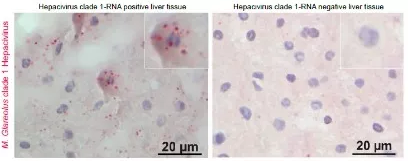 在病毒感染動(dòng)物模型的建立和驗(yàn)證中,Drexler JF 團(tuán)隊(duì)通過 RNAscope 的方法,檢測(cè)小鼠肝細(xì)胞內(nèi) HCV 病毒的存在和分布狀況,確認(rèn) HCV 病毒感染動(dòng)物模型建立成功(下圖中的紅色信號(hào)點(diǎn)[4]。