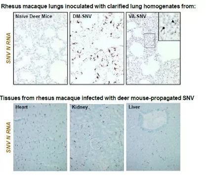 相同的 RNAscope 應(yīng)用實(shí)例也被報(bào)道在漢他病毒(Sin Nombre/Hantavirus,SNV)感染病毒動(dòng)物模型中。RNAscope 結(jié)果確認(rèn)漢塔病毒存在于恒河猴肺臟上皮細(xì)胞內(nèi)(下圖中棕色信號(hào)點(diǎn))[5]。