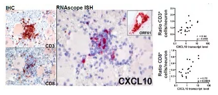 RNAscope 檢測(cè)結(jié)果顯示感染過 SVV 之后,伴隨著 CD8 陽性 T 細(xì)胞的聚集,同一區(qū)域表達(dá) CXCL10 細(xì)胞趨化因子,提示 T 細(xì)胞的聚集是由 CXCL10 因子誘導(dǎo)引發(fā)的[4]。