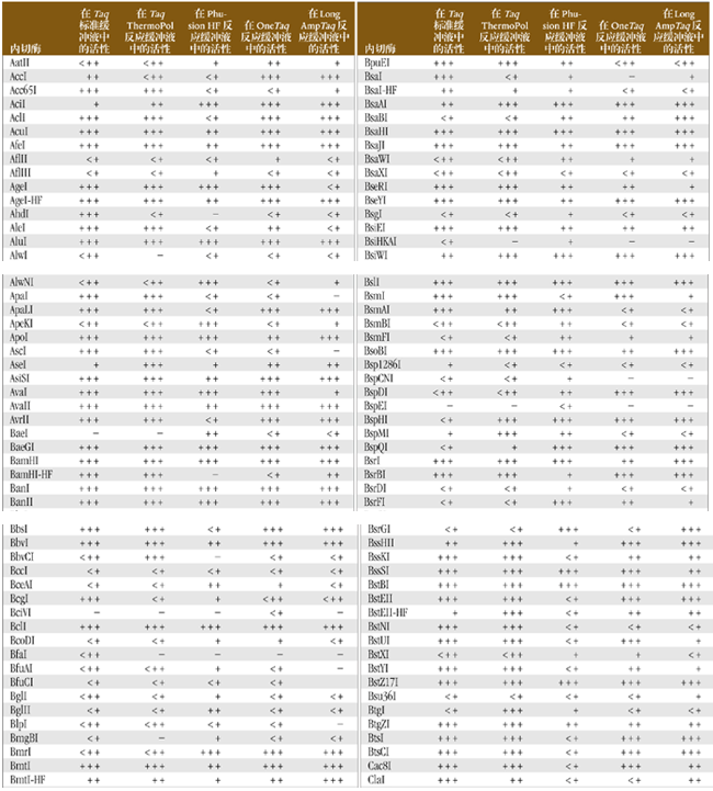 通常,PCR 反應后還要對產(chǎn)物進行酶切才能進行下一步工作。為了方便起見,可以將內(nèi)切酶直接加到 PCR 反應產(chǎn)物中,而省略純化 PCR 產(chǎn)物的步驟。下表歸納了在 Taq、Phusion*、OneTaq 和 LongAmpTaq PCR 產(chǎn)物混合物中各種限制性內(nèi)切酶的酶切活性。50 μl 反應體系中,將 5 單位內(nèi)切酶加入到 PCR 反應產(chǎn)物中,在適當?shù)臏囟认路磻?1 小時,凝膠電泳分析酶活性。PCR 反應產(chǎn)物中包括:1X ThermoPol 反應緩沖液、標準 Taq 反應緩沖液、Phusion HF 反應緩沖液、OneTaq 標準反應緩沖液或 LongAmpTaq 反應緩沖液,含 dNTPs(終濃度為 200 μM)、1 μg DNA 和 1 單位 Taq DNA 聚合酶。