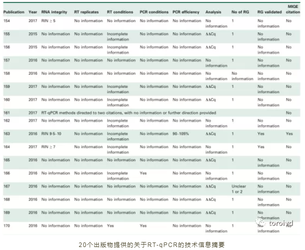 結(jié)果再現(xiàn)性問(wèn)題2013年,《自然》(Nature)雜志發(fā)表的一篇論文綜述得出結(jié)論,自MIQE指南發(fā)布以來(lái),有關(guān)RT-qPCR方案的必要信息的報(bào)告實(shí)際上有所惡化。雖然指南強(qiáng)烈建議納入必要的技術(shù)信息,但分析的10篇論文中沒(méi)有一篇報(bào)道了這一信息。這意味著沒(méi)有向讀者提供任何有關(guān)RNA完整性、RNA純度、RT條件或PCR效率的信息,而且所有的出版物都使用了一種不恰當(dāng)?shù)臄?shù)據(jù)分析方法,這種方法在15年前已經(jīng)被質(zhì)疑。作者對(duì)《自然》雜志的20篇近期論文進(jìn)行了重復(fù)分析,得出了基本相同的結(jié)論。更諷刺的是,報(bào)道透明度與期刊的影響因子呈負(fù)相關(guān)。